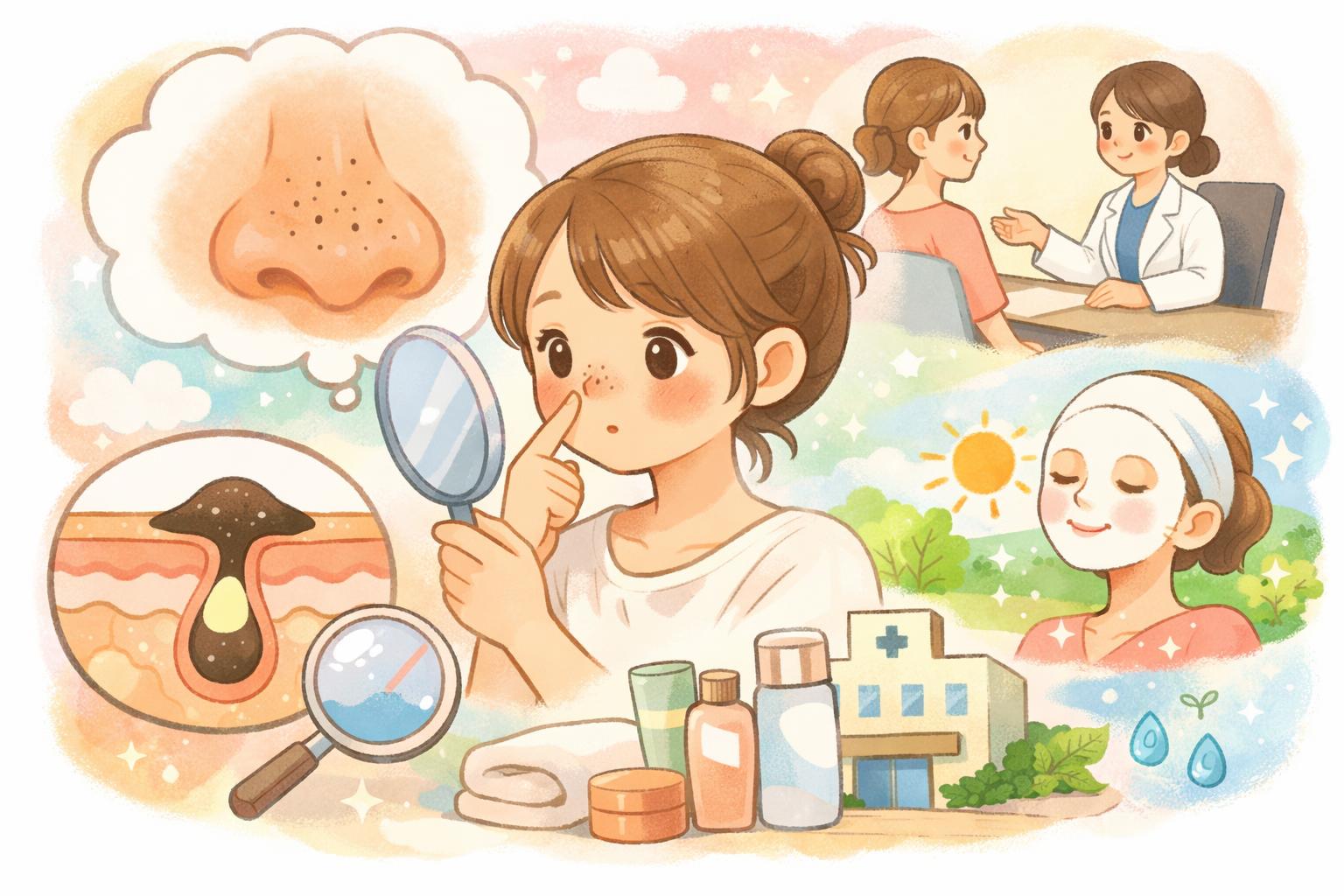 毛穴の黒ずみ「いちご鼻」は、角栓の酸化やメラニン色素の沈着が主な原因であり、無理な押し出しや過度な摩擦は逆効果です。肌に優しい丁寧なクレンジングと洗顔で汚れを落とし、十分な保湿でバリア機能を整えることが基本。ピーリング剤やビタミンC誘導体を用いた適切な角質ケアも効果的です。