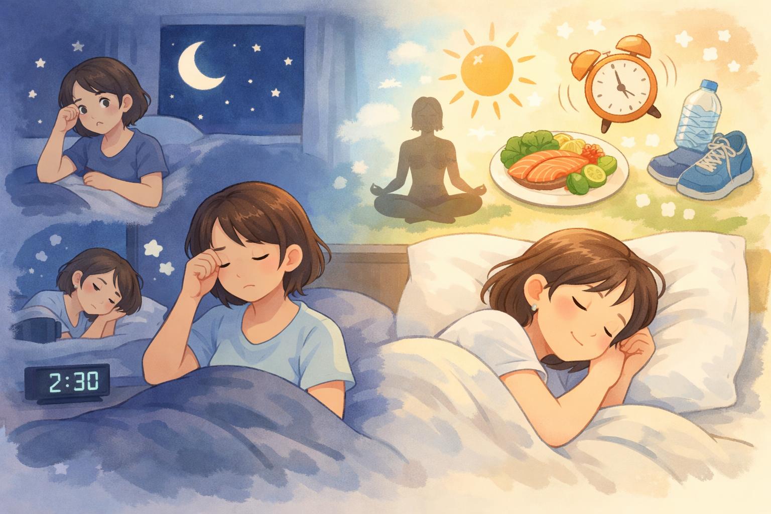 「夜中に何度も目が覚める」「朝起きても疲れが取れない」そんな不眠の悩みを抱えていませんか?本記事では、科学的根拠に基づいた最新の不眠解消メソッドを専門家が徹底解説します。単なる一時しのぎではない、根本的な不眠の原因からタイプを理解し、光や温度、心理テクニック、食事、運動といった多角的なアプローチで、あなたの睡眠の質を劇的に向上させる方法を網羅。この記事を読み終える頃には、朝までぐっすり眠り、日中のパフォーマンスを最大限に引き出すための具体的な解決策が手に入ります。もう不眠に悩む必要はありません。今日から実践できる効果的な方法で、快適な睡眠を取り戻しましょう。